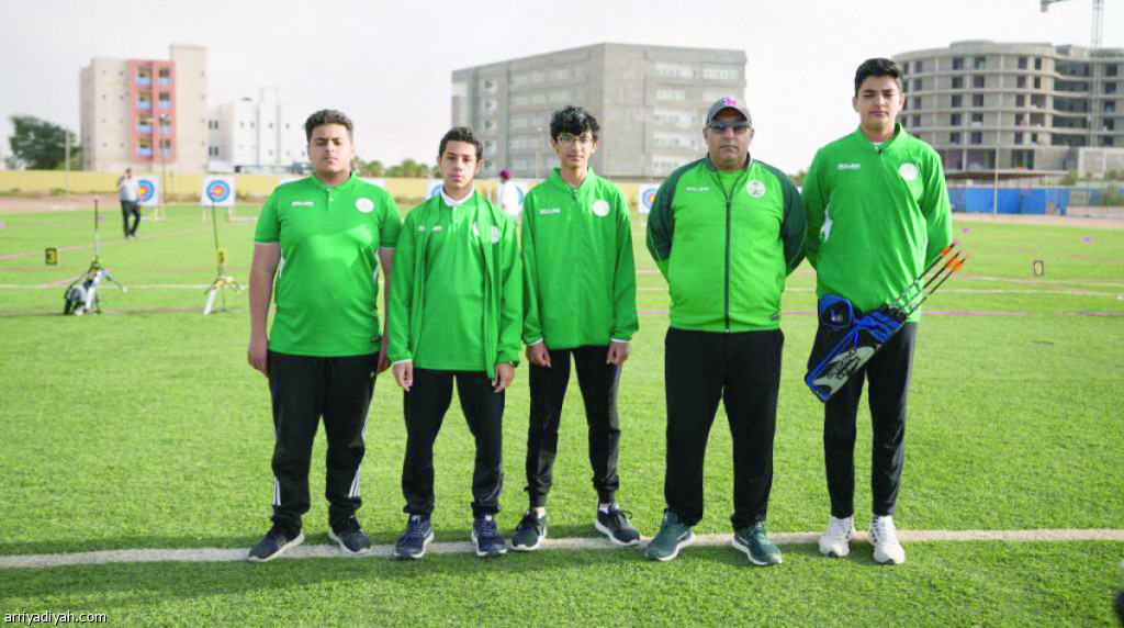 صورة التقطت أمس للاعبي المنتخب السعودي للسهام للناشئين مع محمد حمدي، مدرب الأخضر بعد حصولهم على المركز الثالث في البطولة العربية (المركز الإعلامي ـ اتحاد السهام)