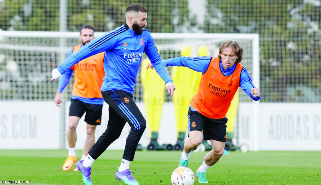 صورة التقطت أمس للفرنسي كريم بنزيمة مهاجم فريق ريال مدريد يحاول المرور من الكرواتي لوكا مودريتش لاعب الوسط خلال التدريبات (المركز الإعلامي ـ ريال مدريد)