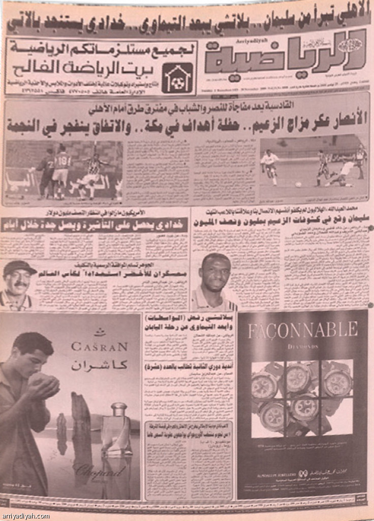 اهتمت الصفحة الأولى، لعدد “الرياضية” ذلك اليوم، بتوقيع عبد الله سليمان، مدافع الأهلي والمنتخب السعودي ، على استمارة الانضمام إلى فريق الهلال. وسرَد خبرٌ موسع في الصفحة تفاصيل التوقيع وتعليق إدارة الأهلي على خطوة اللاعب.. وأبرزت الصفحة ذاتها نتائج عدد من مباريات الجولة الـ 5 من الدوري السعودي 2000ـ2001.