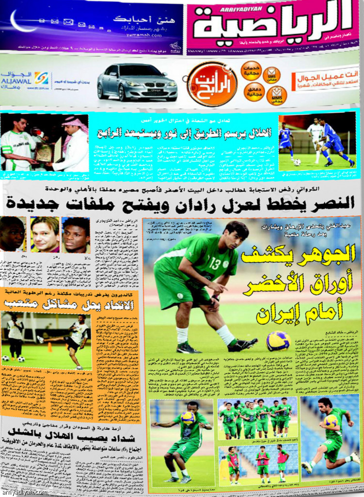 أبرزت “الرياضية” في صفحتها الأولى، ذلك اليوم، آخر مستجدات مستقبل الكرواتي رادان، مدرب فريق النصر الأول لكرة القدم آنذاك. وتناولت الصفحة ذاتها تصريحات للأمير نواف بن سعد، نائب رئيس نادي الهلال في تلك الفترة، تحدث فيها عن أنه في حال رغب ناديه في مفاوضة محمد نور، قائد فريق الاتحاد، فسيلسلك الطرق الرسمية. كما دونت الصفحة آخر تحضيرات ناصر الجوهر، مدرب المنتخب السعودي الأول لكرة القدم آنذاك، لمباراة افتتاح التصفيات الآسيوية أمام المنتخب الإيراني.