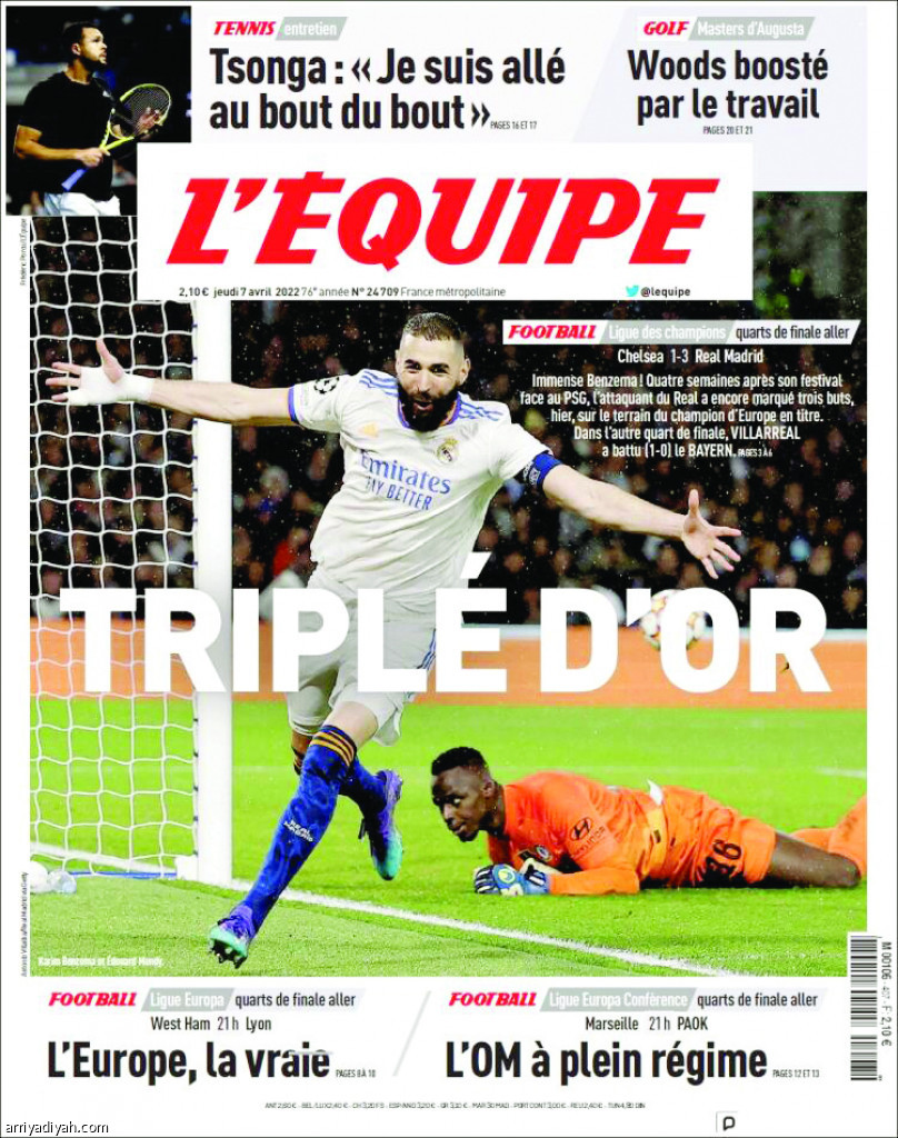 صحيفة “ليكيب” الفرنسية من جانبها أفردت صورة بنزيمة مواطنها، وكتبت “تريبل دور”، في إشارة إلى أنه قد حان الوقت لينال جائزة الكرة الذهبية.