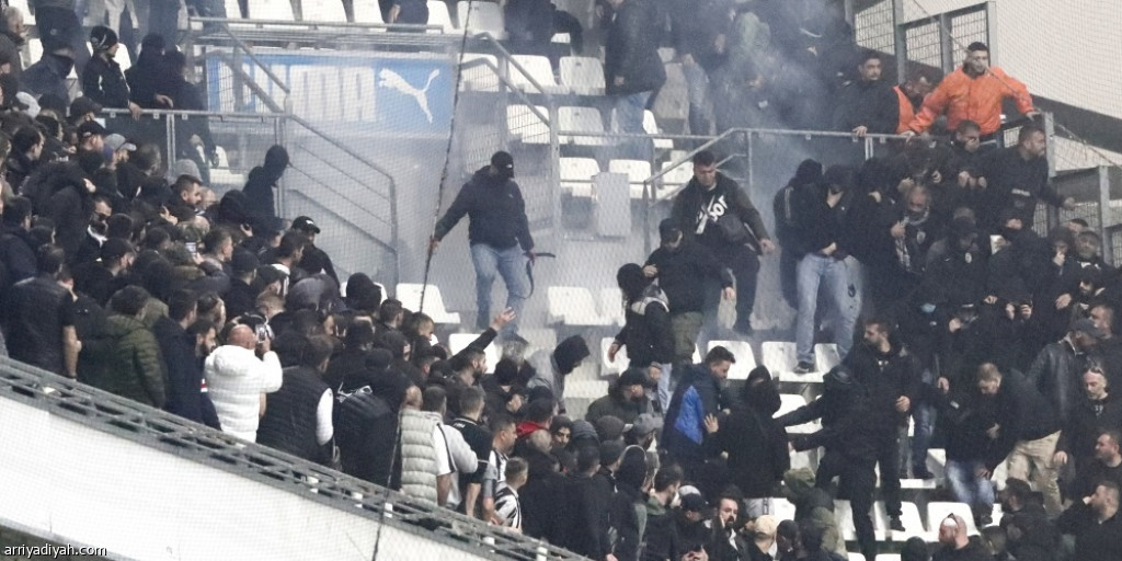 وتم إلقاء المقذوفات والمقاعد على أرض الملعب من قبل مشجعي الفريق اليوناني، بينما أطلق مناصرو الفريقين القنابل الدخانية والمفرقعات النارية فوق السياج الأمني.