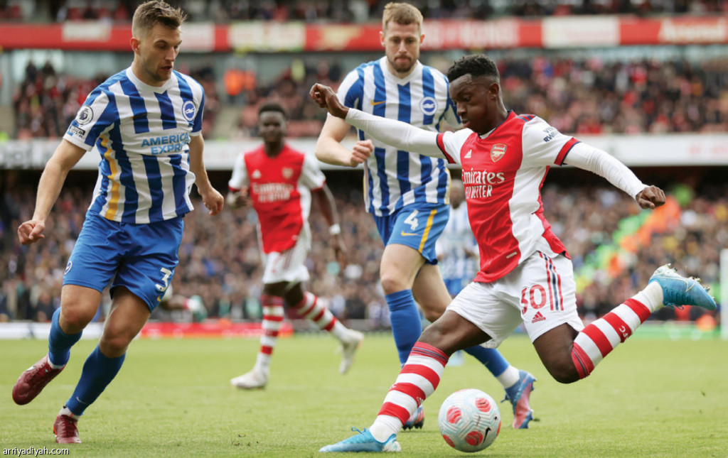 صورة التقطت أمس للإنجليزي إيدي نكيتاه، مهاجم أرسنال، يسدد الكرة خلال مباراة فريقه أمام برايتون(الفرنسية)
