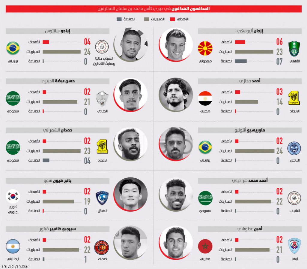 تصدَّر المقدوني أزجان أليوسكي، لاعب فريق الأهلي الأول لكرة القدم، قائمة الهدافين المدافعين في منافسات دوري كأس محمد بن سلمان للمحترفين برصيد 6 أهداف، سجَّل 4 منها عن طريق ركلات الجزاء.
