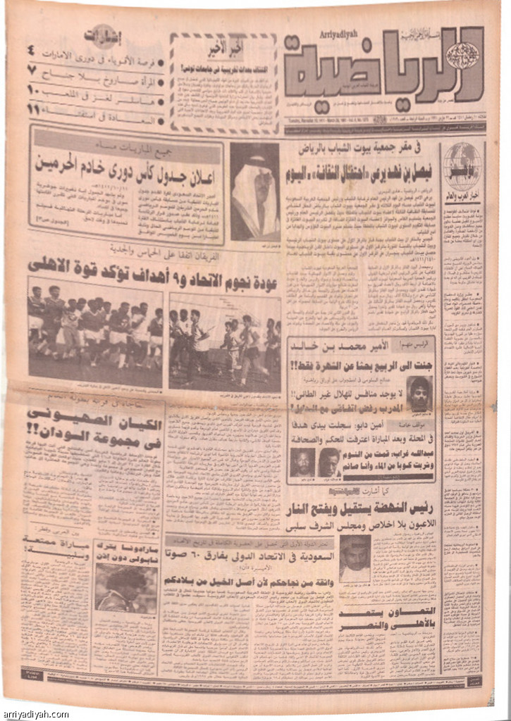 نقلت الصفحة الأولى لـ “الرياضية”، ذلك اليوم، بين عددٍ من الأخبار الكروية المحلية، منها رعاية الأمير فيصل بن فهد الرئيس العام لرعاية الشباب الحفل الختامي للمسابقة الثقافية الثالثة لأعضاء بيوت الشباب في السعودية، إضافة إلى إعلان جدول كأس دوري خادم الحرمين الشريفين للموسم الرياضي 1991، كما شهد العدد استقالة الأمير خالد بن فهد بن ناصر من كرسي رئاسة نادي النهضة.