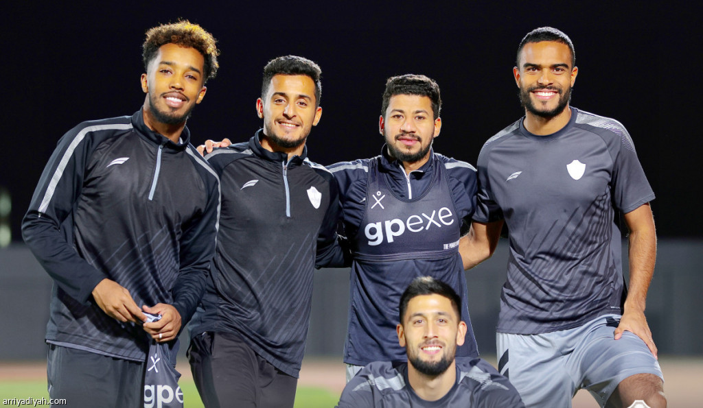 صورة التقطت أمس الأول لدينر جوميز ومحمد عطية وعبد الكريم القحطاني ومختار علي و توبياس قبل بداية الحصة التدريبية (المركز الإعلامي - الطائي)