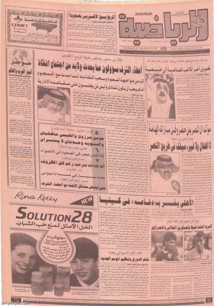 نقلت الصفحة الأولى من “الرياضية” مقترحًا من الأمير طلال بن منصور، رئيس نادي الاتحاد السابق، بتنظيم اجتماع شرفي عاجل لمناقشة أوضاع النادي الإدارية شريطة عقده “للمصارحة وليس للمجاملة”.. وأبرزت الصفحة قرار الراحل الأمير فيصل بن فهد، الرئيس العام لرعاية الشباب ، بتحويل آخر ملاعب الإنجيلة الصناعية في السعودية، وعددها 11، إلى عشب طبيعي، بينها ملعب مدينة الأمير سلطان بن عبد العزيز الرياضية في أبها.