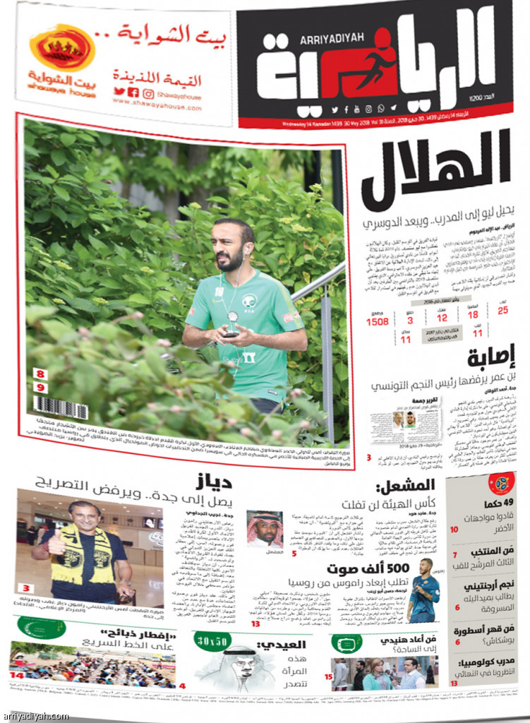 نشرت “الرياضية”، عبر صفحتها الأولى، خبرًا عن وصول المدرب الأرجنتيني رامون دياز إلى جدة لقيادة فريق الاتحاد الأول لكرة القدم خلال موسم 2018ـ2019.. وأفاد الخبر الرئيس للصفحة بدراسة نادي الهلال مستقبل البرازيلي ليو بوناتيني، رأس الحربة، مع الفريق.. وواصلت الصفحة متابعاتها بالصور لمعسكر المنتخب السعودي الأول في سويسرا قبل أيام من مونديال “روسيا 2018”.