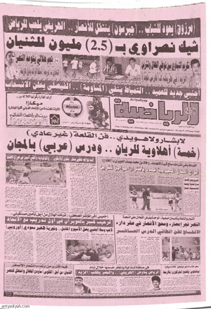تصدّر فوز فريق الأهلي الأول لكرة القدم بخمسة أهداف نظيفة على الريان القطري، في بطولة الأندية العربية، الصفحة الأولى لـ “الرياضية”، التي عنونَت “خمسة أهلاوية للريان.. ودرس عربي بالمجان”.. ونقل خبر آخر في الصفحة عن خميس العويران، لاعب الوسط، قوله “تركت الهلال من أجل تأمين مستقبلي”، في إشارةٍ إلى انتقاله إلى الاتحاد.. ولفتت الصفحة ذاتها إلى فوز النصر بأربعة أهداف لاثنين على الأنصار ضمن منافسات الدوري الممتاز 2001ـ2002.