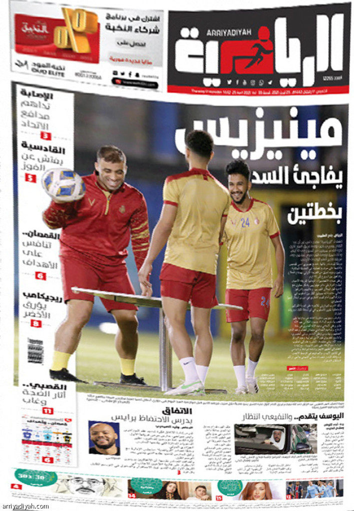 اهتم غلاف “الرياضية” بتحضيرات فريق النصر لمواجهة السد القطري في دوري آبطال آسيا، ونشر صورة للاعبيه المغربي عبد الرزاق حمد الله وخالد الغنام وعبد الإله العمري خلال التدريبات تحت عنوان: “مينيزيس يفاجئ السد بخطتين”. ونقلت الصحيفة عن مصدر خاص غياب عبد الفتاح عسيري لاعب الوسط من أسبوع إلى عشرة أيام بسبب الإصابة. كما تناول الغلاف سباق انتخابات رئاسة النادي الأهلي وعنونت: “اليوسف يتقدم.. والنفيعي انتظار”.