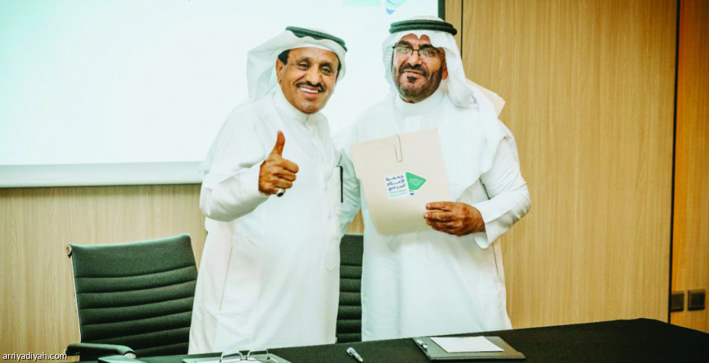 صورة التقطت أمس لخالد آل دغيم وعبد الله العامر أثناء توقيع الاتفاقية (خاصة بـ”الرياضية”)