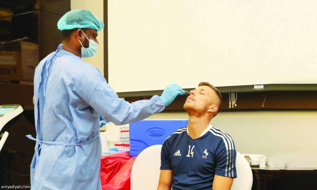 صورة التقطت أمس للسلوفاكي فيليب كيش، لاعب فريق الاتفاق الأول لكرة القدم، أثناء إجراء مسحة كورونا في مقر سكن الفريق بالإمارات(المركز الإعلامي ـ الاتفاق)