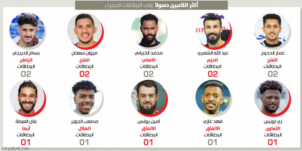 البطاقات الحمراء.. الاتفاق والفتح يتقاسمان الصدارة