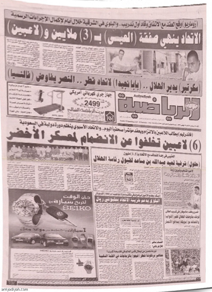 أبرزت الصفحة الأولى لـ “الرياضية” إتمام نادي الاتحاد التعاقد مع حمد العيسى، مدافع فريق الاتفاق الأول لكرة القدم، مقابل 3.5 مليون ريال تشمل مستحقات الاتفاق وراتب اللاعب وتنازل الاتحاد عن اللاعبَين علي المطرود ومحمد المولد للنادي الشرقي.. وأفاد خبر آخر في الصفحة بموافقة الاتحاد على رحيل النيجيري بابا نجيدا، لاعب الوسط، إلى فريق الاتحاد القطري معارًا.. وأشارت الصفحة ذاتها إلى بدء المنتخب السعودي معسكرًا في الرياض استعدادًا للمشاركة في كأس العرب الثامنة “الكويت 2002”.