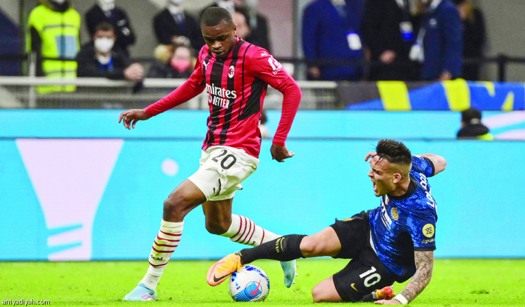 صورة التقطت أمس للأرجنتيني لاوتارو مارتينيز، مهاجم إنتر ميلان، في كرة مشتركة مع الفرنسي بيير كالولو، مدافع ميلان، خلال مباراة الفريقين (الفرنسية)