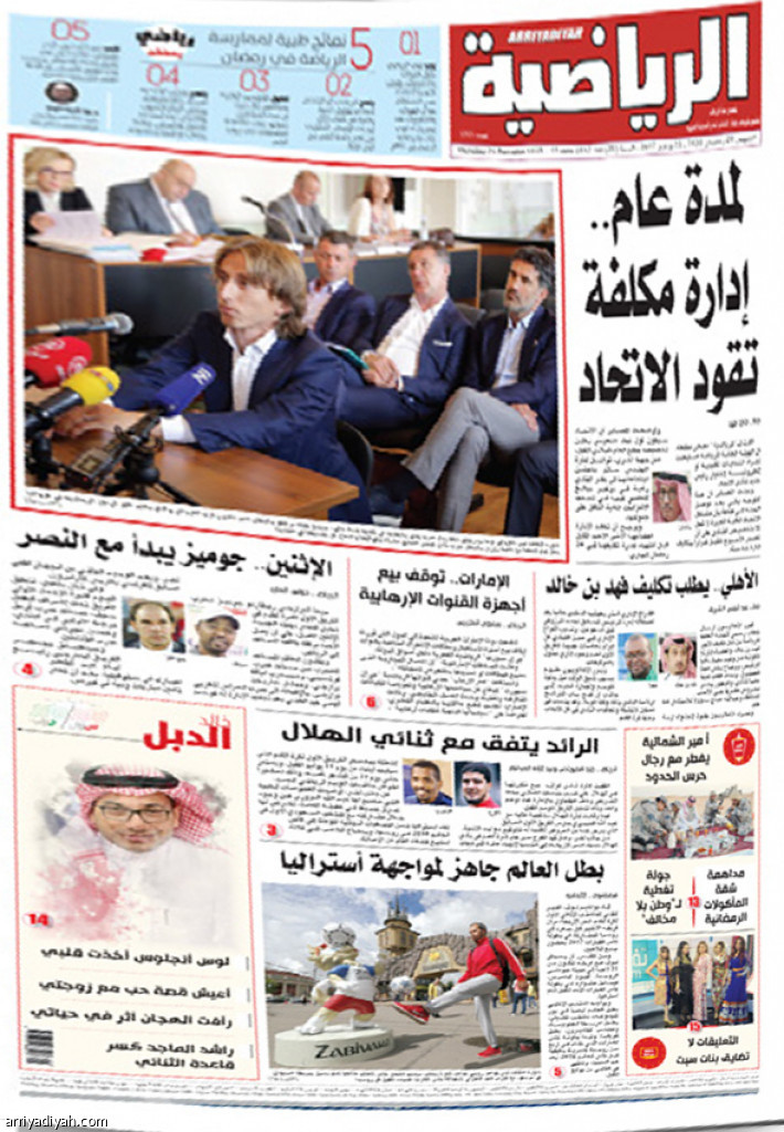 انفرد الصفحة الاولى في “الرياضية” بخبر تكليف إدارة لقيادة نادي الاتحاد، بعد استبعاد الهيئة العامة للرياضة إجراء انتخابات لاختيار رئيس جديد. وكتبت: “لمدة عام.. إدارة مكلفة تقود الاتحاد”. أما الصورة الرئيسة فكانت للكرواتي لوكا مودريتش لاعب وسط ريال مدريد، وهو يدلي بشهادته أمام المحكمة في قضية فساد مالي. كما نشر خبرًا حول طلب الأهلاويين تكليف فهد بن خالد بقيادة النادي.