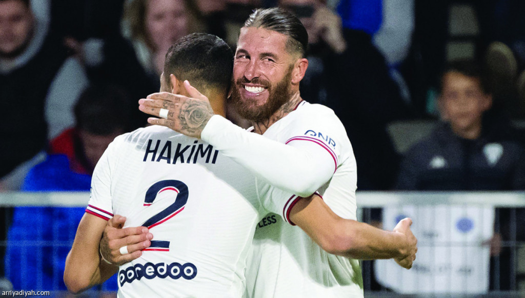 صورة التقطت أمس لأشرف حكيمي لاعب باريس سان جيرمان يحتفل مع راموس زميله (الفرنسية)