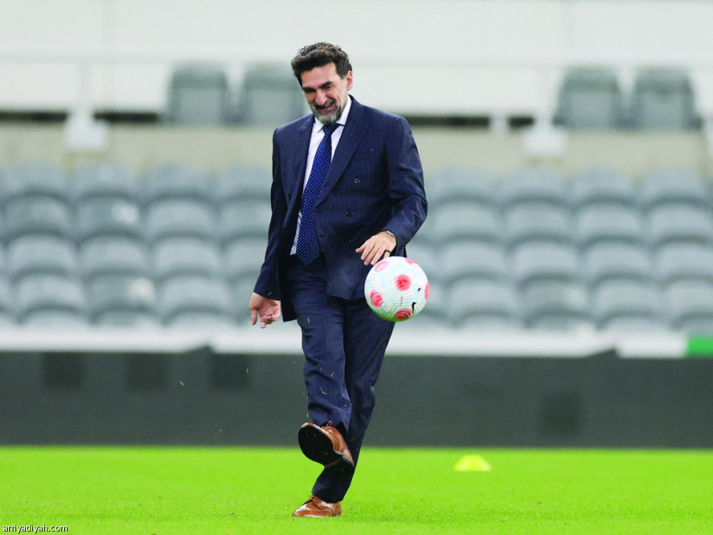 صور ة التقطت أمس من مباراة نيوكاسل يونايتد وكريستال بالاس الإنجليزيين.. ويظهر ياسر الرميان رئيس النادي ومحافظ صندوق الاستثمارات السعودي يستعرض مهاراته بالكرة بعد المباراة (رويترز)