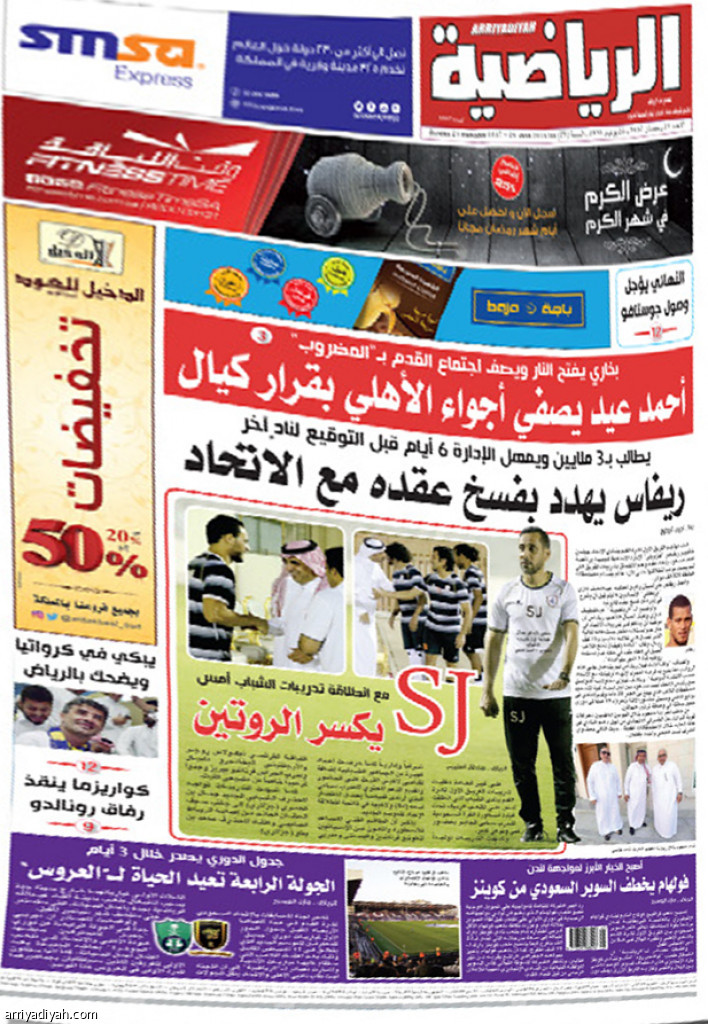 تناول الخبر الرئيس في الصفحة الأولى لـ “الرياضية” تفاصيل أزمةٍ بين نادي الاتحاد والفنزويلي جيلمين ريفاس، مهاجم الفريق الأول، وتهديد الأخير بالرحيل وفسخ عقده إذا لم يتسلم مستحقاته المالية البالغة 820 ألف دولار.. وأفادت الصفحة باختيار ملعب نادي فولهام الإنجليزي موقعًا لمباراة السوبر السعودي 2016 بين فريقي الأهلي والهلال.. وجاء في عنوانٍ آخر “أحمد عيد يصفي أجواء الأهلي بقرار كيال”.