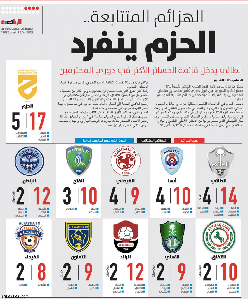 سجَّل فريق الحزم الأول لكرة القدم النتائج الأسوأ بـ 17 خسارة في الدوري، بين فرق دوري كأس محمد بن سلمان للمحترفين، إضافة إلى تلقيه خمس هزائم متتالية الموسم الجاري.