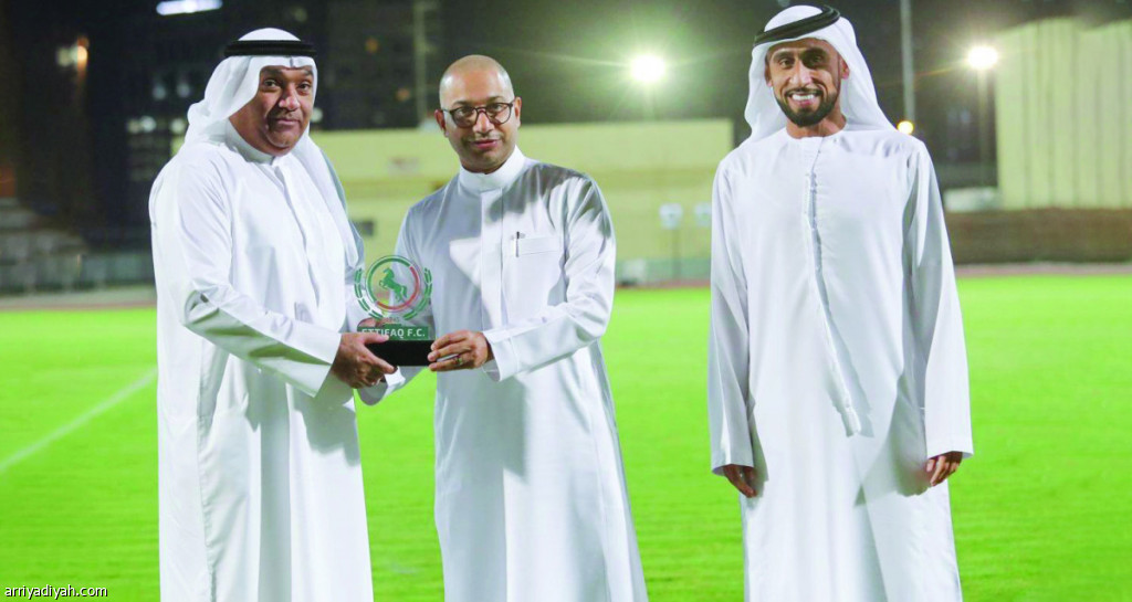صورة التقطت أمس لخالد الدبل رئيس نادي الاتفاق يتسلم درعًا تذكارية من خليفة الملاحي عضو إدارة نادي العروبة(المركز الإعلامي - الاتفاق)