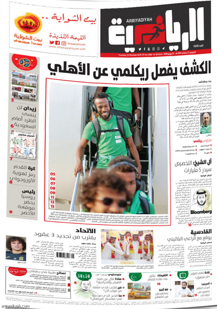 اهتمت الصفحة الأولى من “الرياضية” بمحاولات النادي الأهلي التعاقد مع الأرجنتيني ماركوس ريكلمي، لاعب نادي بوليفار البوليفي، لمدة موسمين في إطار تقوية الفريق الأول لكرة القدم قبل موسم 2018ـ2019.. وأشار الخبر الرئيس إلى انتظار النادي خضوع اللاعب إلى فحص طبي للتأكد من سلامة ركبته قبل إتمام التعاقد.. وتوسطت الصفحةَ صورةٌ لفهد المولد، الجناح الدولي، ينزل مع زملاء المنتخب السعودي الأول من طائرةٍ أقلّت الأخضر إلى ألمانيا قبل أيامٍ من مونديال “روسيا 2018”.