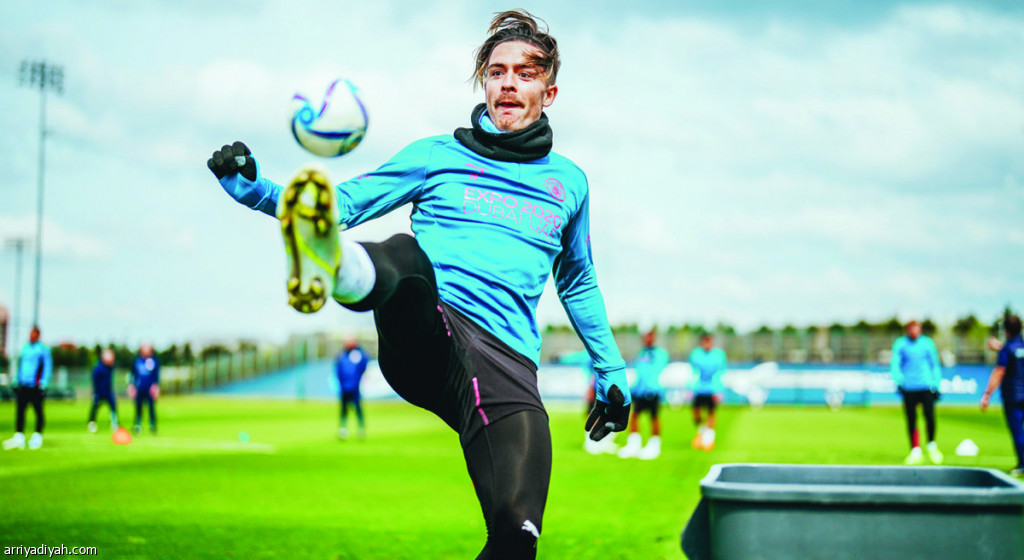صورة التقطت أمس للإنجليزي جاك جرليش، جناح مانشستر سيتي، يتحكم بالكرة في الحصة التدريبية (المركز الإعلامي ـ السيتي)