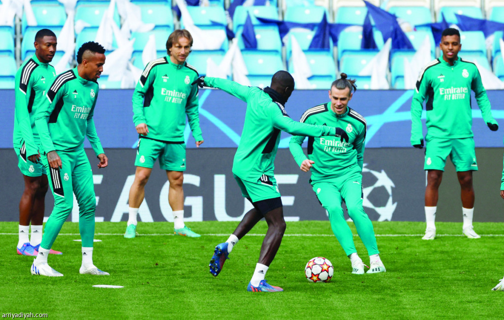 صورة التقطت أمس للويلزي جاريث بيل والفرنسي فيرلاند ميندي يتنافسان على كرة بمتابعة من الكرواتي لوكا مودريتش والنمساوي ديفيد آلابا والبرازيلي إدير ميليتاو خلال الحصة التدريبية لفريق ريال مدريد الإسباني الأول لكرة القدم التي جرت على ملعب الاتحاد في مدينة مانشستر الإنجليزية استعدادًا لمواجهة سيتي اليوم في ذهاب نصف نهائي دوري الأبطال (رويترز)