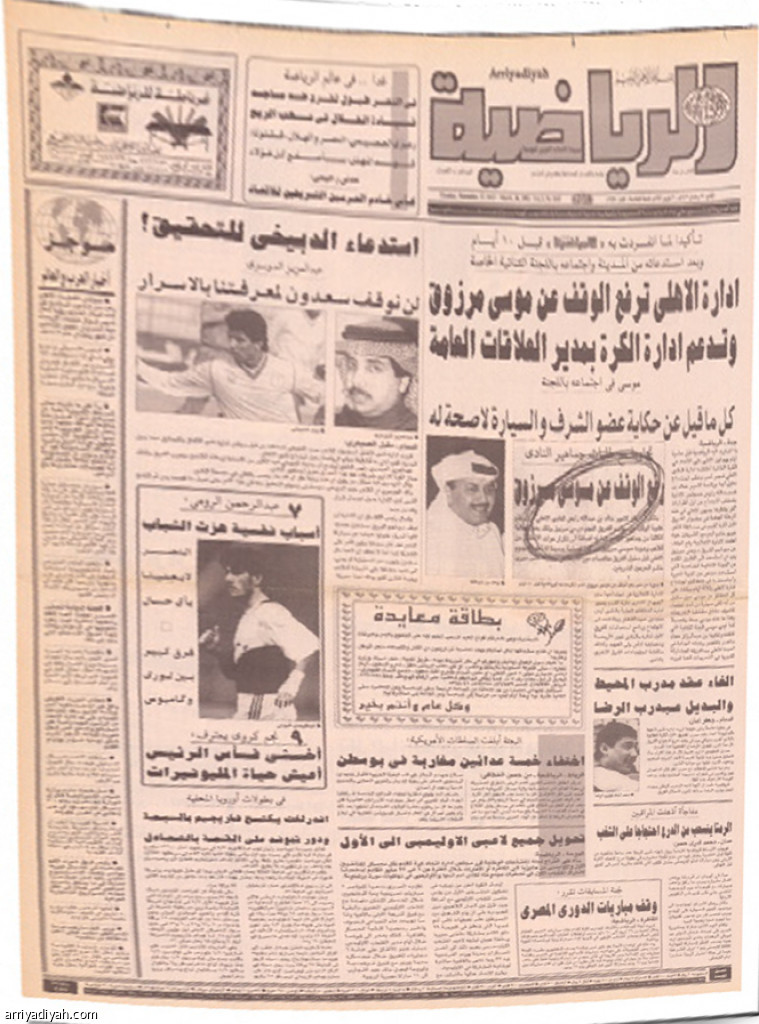 أفردت الصفحة الأولى لـ “الرياضية” مساحةً لتغطية قرار نادي الاتفاق إيقاف حمد الدبيخي، لاعب الفريق الأول لكرة القدم، للتحقيق معه بعد إدلائه بحوار صحافي حول أوضاع ناديه.. ونقل الخبر عن عبد العزيز الدوسري، رئيس النادي، اتهامه الدبيخي بالإساءة إلى لاعبي ومدرب الفريق والجهاز الإداري وحتى الجماهير.. فيما أورد الخبر الرئيس للصفحة رفع النادي الأهلي الإيقاف عن موسى مرزوق، مهاجم الفريق الأول لكرة القدم، إثر نفيه أمام لجنة تحقيق داخلية تلقيه سيارة من عضو شرف مقابل مقاطعة التدريبات.