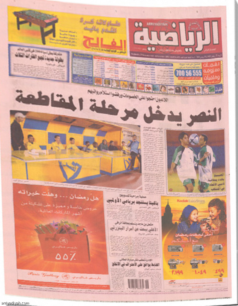 عنونت “الرياضية” في صفحتها الأولى “النصر يدخل مرحلة المقاطعة” و”اللاعبون احتجوا على الخصومات ورفضوا استلام رواتبهم”.. وأورد خبرها الرئيس معلومات عن احتجاج لاعبي فريق النصر الأول لكرة القدم على خصومات كبيرة من رواتبهم المتأخرة ورفضهم استلام الراتب في وقت هدد فيه ماجد الدوسري، لاعب الوسط، بالانقطاع حتى نهاية الموسم للسبب ذاته.. وأشارت الصفحة ذاتها إلى موافقة المهاجم العماني هاني الضابط على الانضمام إلى فريق الاتفاق الأول لكرة القدم.