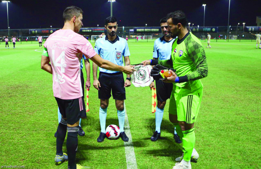 صورة التقطت أمس للسلوفاكي فيليب كيش قائد فريق الاتفاق الأول لكرة القدم مع حارس فريق الظفرة قبل بداية المباراة يتبادلان شعاري الفريقين (المركز الإعلامي - الاتفاق)