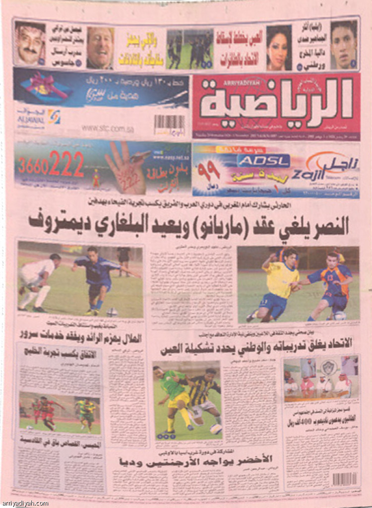 كشفت الصفحة الأولى لـ “الرياضية” عن اعتزام نادي النصر إلغاء عقد البرتغالي ماريانو، مدرب الفريق الأول لكرة القدم، ونيلها موافقة البلغاري ديميتروف على العودة إلى تدريب الفريق وسط موسم 2005ـ2006.. وأبرزت الصفحة تقليص أعضاء شرف نادي الطائي عجز ميزانيته ودعمهم إياه بـ 400 ألف ريال خلال اجتماع موسع.. ونقل خبر آخر تأكيد عماد المحيسن، نائب رئيس نادي القادسية، بقاء اللبناني محمد القصاص، رأس الحربة، مع الفريق الأول.
