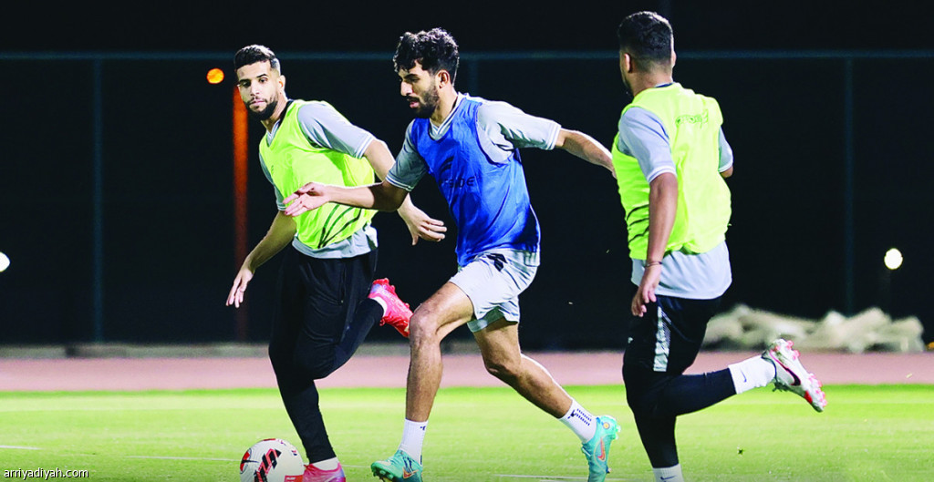 صورة التقطت أمس الأول لمحمد صالح لاعب فريق الطائي يحاول المرور من فهد الجهني ومحمد عطية زميليه في الفريق خلال التدريبات (المركز الإعلامي - الطائي)