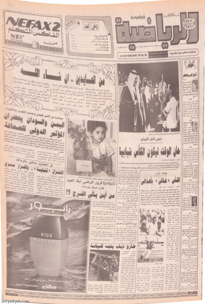 نقلت الصفحة الأولى لـ “الرياضية” وعدًا من يوسف جازع، مهاجم فريق الهلال الأول لكرة القدم، لأنصار ناديه خلاصته “الكأس هلالية بأهدافي”.. وتعهد جازع، في تصريح خاص، بتدارك تراجع مستواه قبل كأس خادم الحرمين الشريفين، 1989م، وترجمة جهود زملائه إلى أهداف.. ونسب عنوان آخر إلى الأمير خالد بن سعد، رئيس نادي الشباب، قوله “حان الوقت لتكون الكأس شبابيًّة”.