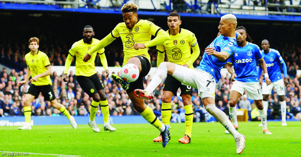 صورة التقطت أمس لريشارليسون مهاجم إيفرتون وجيمس ريس مدافع تشيلسي في كرة مشتركة خلال مباراة الفريقين أمس (رويترز)