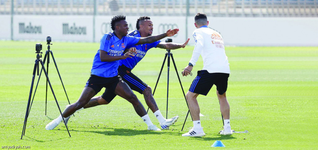 صورة التقطت أمس للبرازيليين إيدر ميلتاو قلب الدفاع وفينسيوس جونيور المهاجم في منافسة جانبية خلال تدريبات فريق ريال مدريد الإسباني الأول لكرة القدم استعدادًا لاستقبال مانشستر سيتي غدًا في إياب نصف نهائي دوري الأبطال (المركز الإعلامي - الريال)
