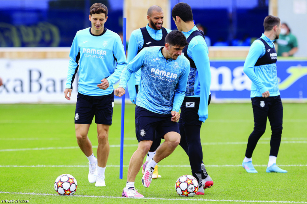 صورة التقطت أمس لجيرارد مورينو مهاجم فياريال يمر بالكرة خلال الحصة التدريبية ويبدو خلفه باو توريس قلب الدفاع (الأوروبية)