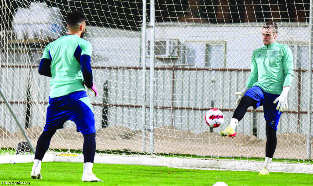 صورة التقطت أمس للأوكراني ماكسيم أناتولييوفيتش حارس مرمى الفتح يتبادل الكرة مع باسل البحراني زميله أثناء التدريبات (المركز الإعلامي ـ الفتح)
