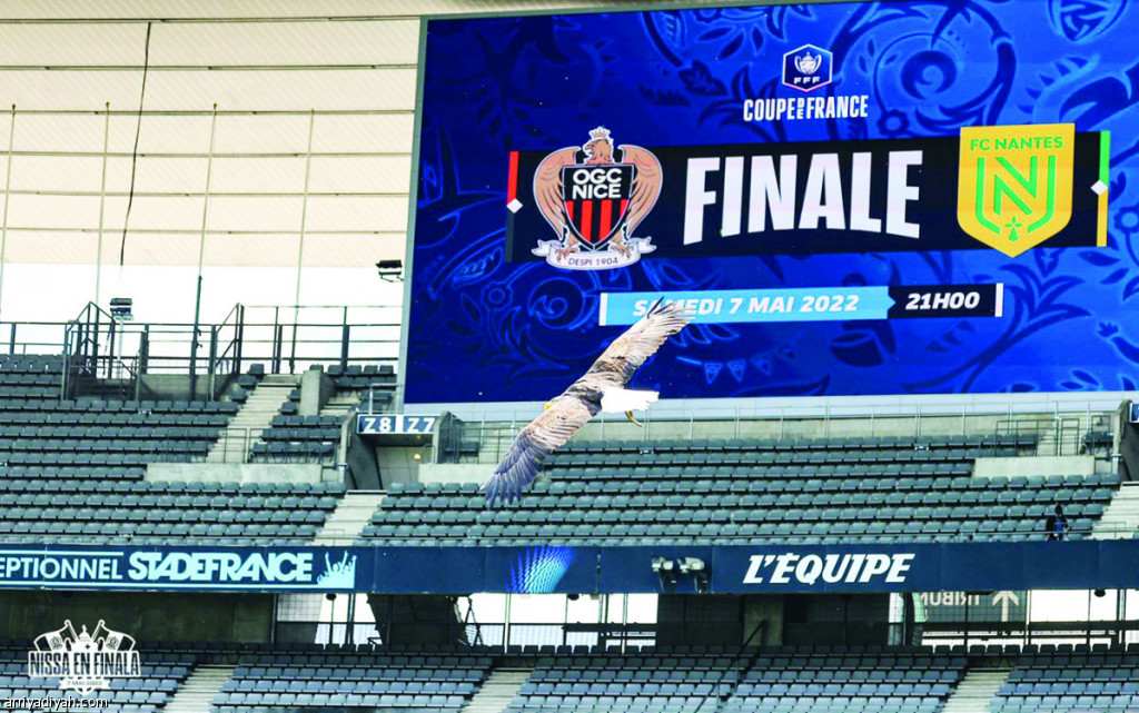 صورة التقطت أمس لتميمة نادي نيس الفرنسي “النسر“ يحلق أمام لوحة ملعب “دو فرانس” الذي يحتضن نهائي كأس فرنسا بين فريقي نيس ونانت (المركز الإعلامي - نيس)