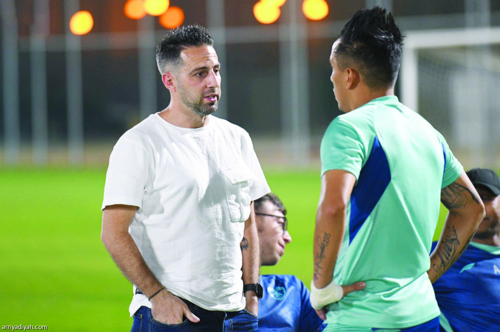 صورة التقطت أمس للبيروفي كويفا لاعب فريق الفتح يتحدث مع البلجيكي يانيك فيريرا مدرب الفريق السابق قبل بداية التدريبات (المركز الإعلامي ـ الفتح)