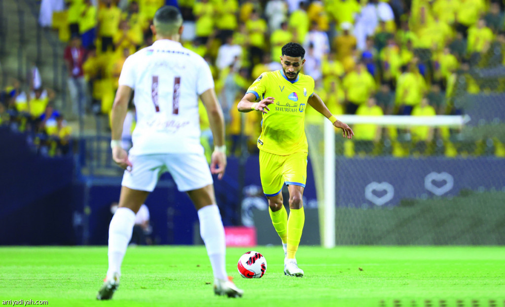 صورة التقطت أمس الأول لعبد الإله العمري لاعب فريق النصر يواجه هتان باهبري لاعب الشباب خلال مباراة الفريقين تصوير: صالح الغنام