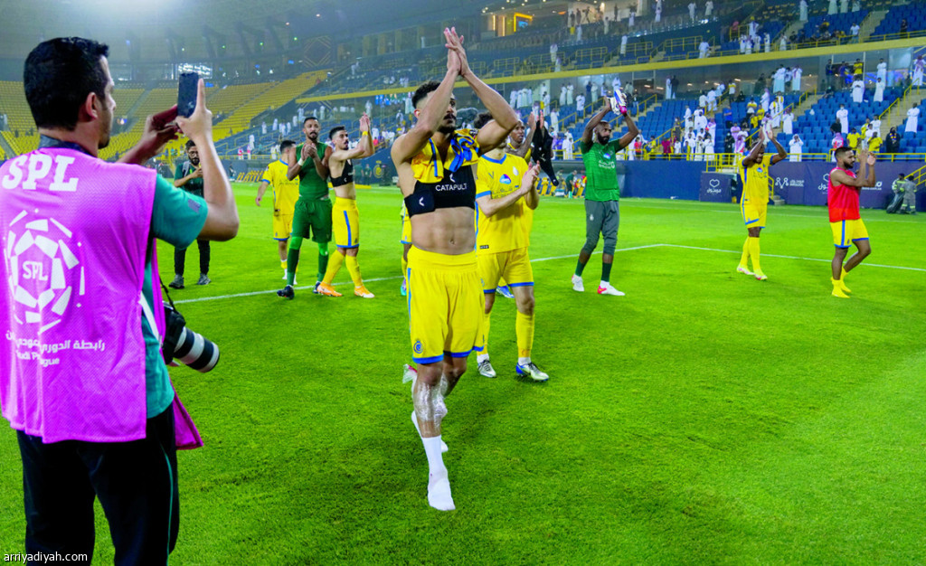 صورة التقطت أمس الأول لعبد الإله العمري مدافع فريق النصر الأول لكرة القدم يتقدم زملاءه لتحية الجماهير بعد انتصارهم على الشباب (المركز الإعلامي - رابطة الدوري)