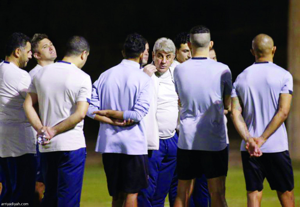 صورة التقطت أمس للمقدوني جوكيكا، مدرب فريق هجر الأول لكرة القدم، أثناء اجتماعه باللاعبين(المركز الإعلامي ـ هجر)