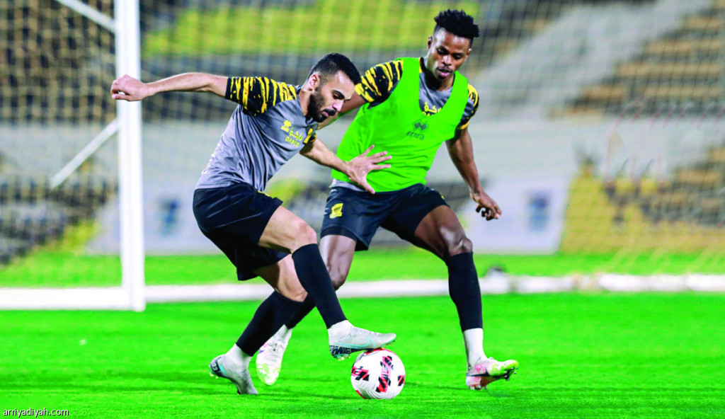 صورة التقطت الجمعة الماضي لمد الله العليان وهارون كمارا، لاعبَي فريق الاتحاد، أثناء التدريبات (المركز الإعلامي ـ الاتحاد)