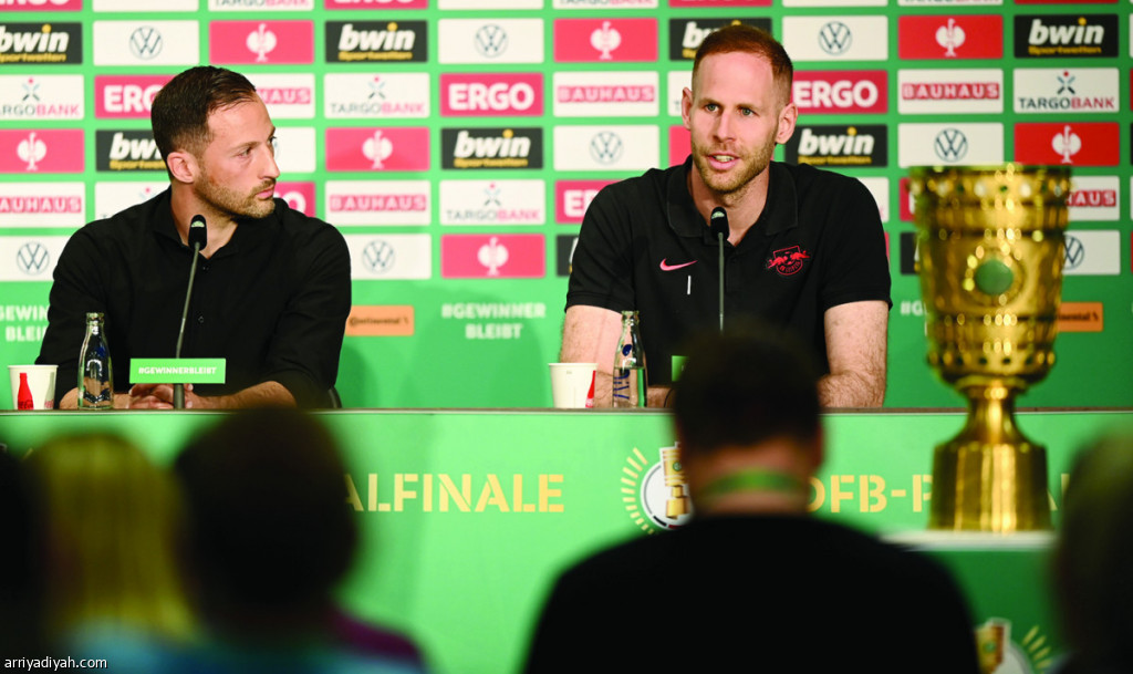 صورة التقطت أمس لبيتر جولاكسي، حارس المرمى، ودومينيكو تيديسكو، مدرب لايبزيج، خلال مشاركتها في المؤتمر الصحافي الذي يسبق نهائي الكأس (المركز الإعلامي - فرايبورج)
