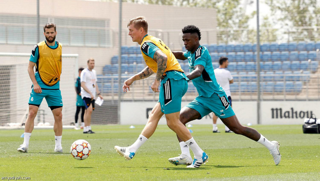 صورة التقطت أمس للألماني توني كروس، لاعب الوسط، يمرر الكرة وسط ملاحقةٍ من البرازيلي فينيسيوس جونيور، المهاجم، خلال الحصة التدريبية لفريق ريال مدريد (المركز الإعلامي - ريال مدريد)
