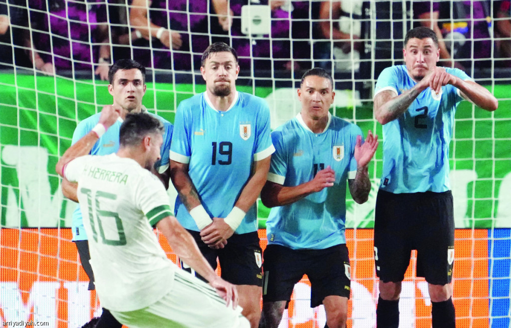 صورة التقطت فجر أمس للمكسيكي هيكتور هيريرا عند تنفيذه ركلة مباشرة بالقرب من مرمى الأوروجواي، خلال لقاء المنتخبين ويظهر حائط صد من 4 لاعبين (رويترز)