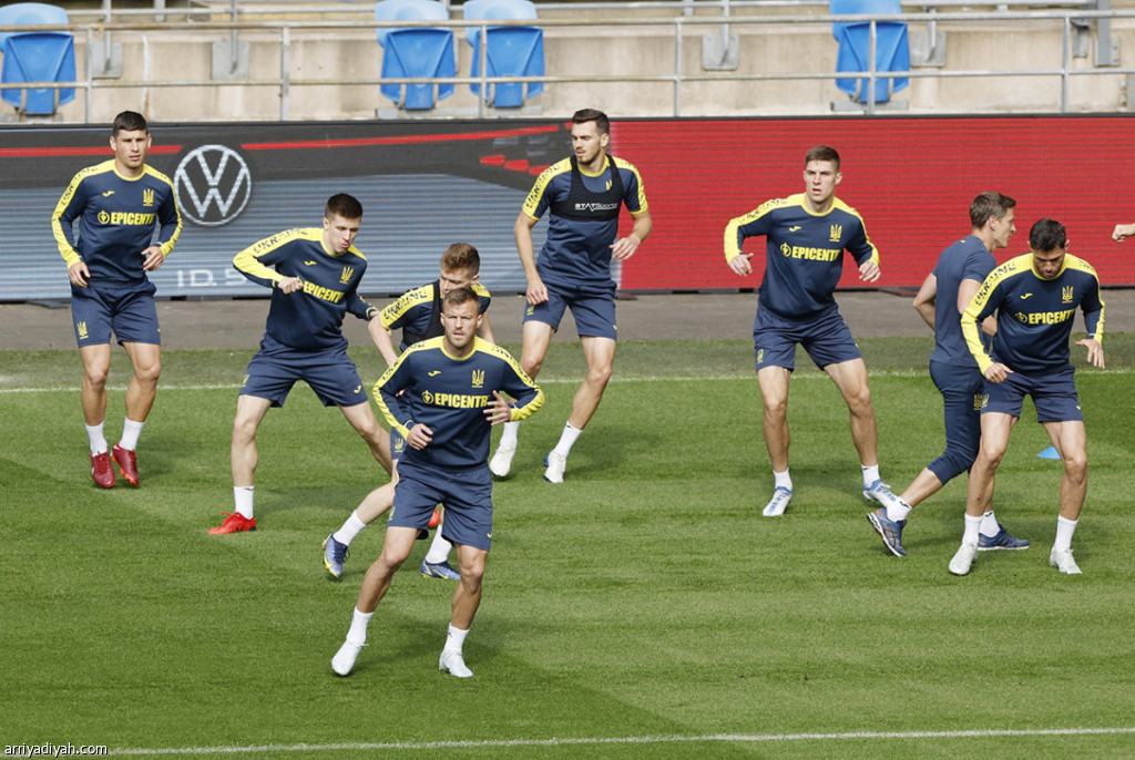 صورة التقطت أمس من تدريبات منتخب أوكرانيا استعدادًا لمواجهة ويلز الحاسمة اليوم (الفرنسية)