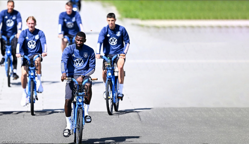 صورة التقطت أمس لأنطونيو روديجر، مدافع منتخب ألمانيا، يتقدم زملاءه أثناء التوجُّه بالدرَّاجات إلى مقر التدريب (حساب إنستجرام ـ أنطونيو روديجر)