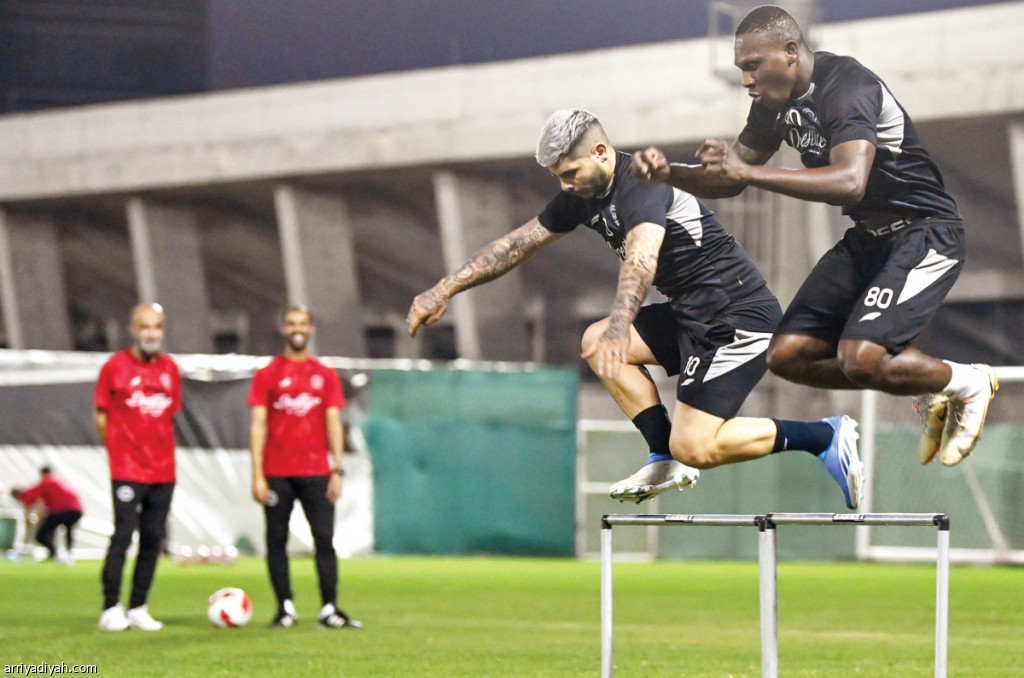 صورة التقطت أمس الأول للكاميروني جون ماري والأرجنتيني إيفر بانيجا يقفزان على الحواجز في الحصة التدريبية لفريق الشباب (المركز الإعلامي - الشباب)